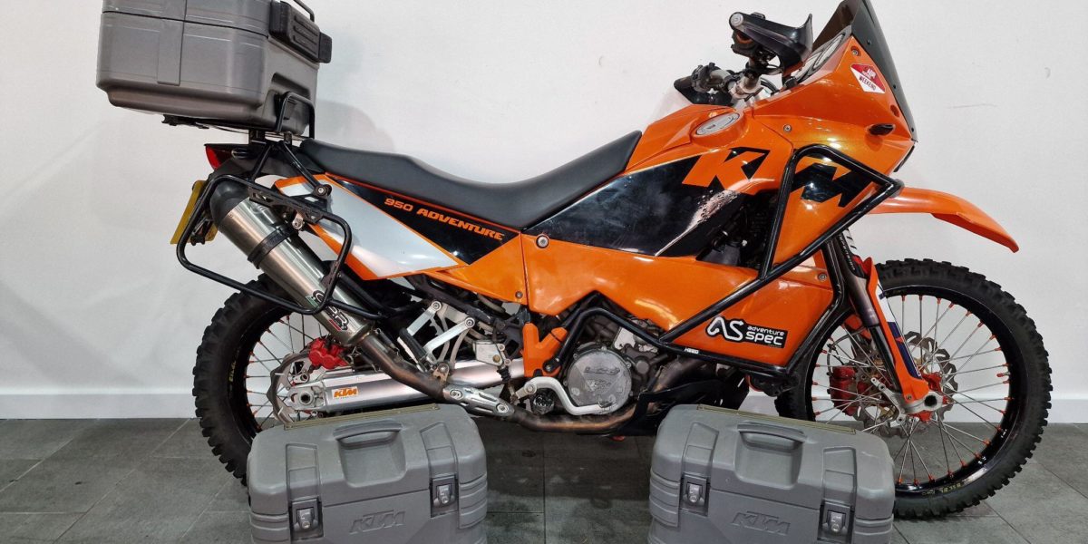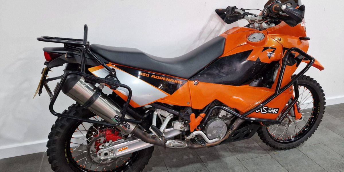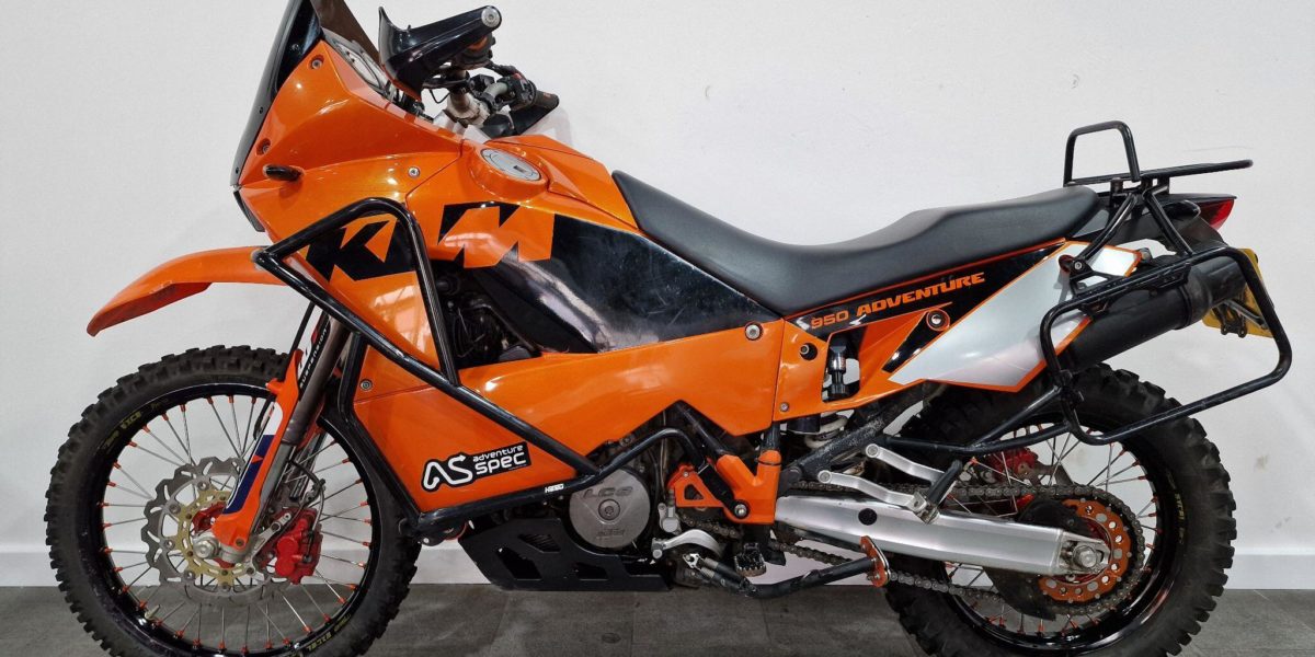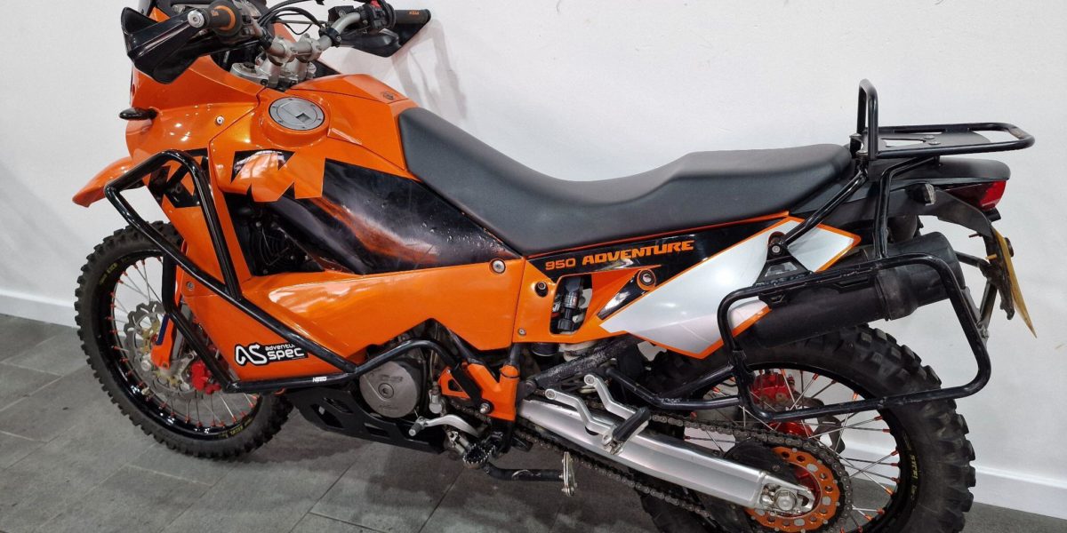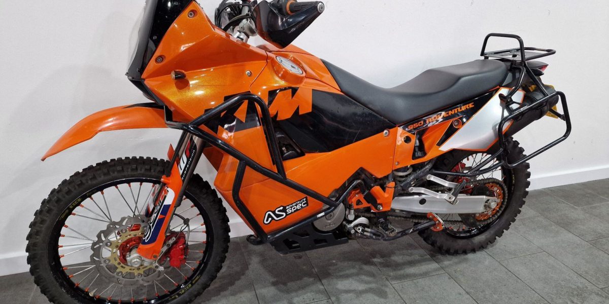 2005 KTM 950 Adventure Rally, prepared for off-road, TET, trial use. SM pro wheels with Excel rims, GPR 2-1 ‘DAKAR’ exhaust, full engine bars, full bx box, Gobi luggage, low screen (original included) alloy bash plate (original included), relocated battery and fuel pump. Vin 909787. . Orange The North West’s Finest Family Run Business